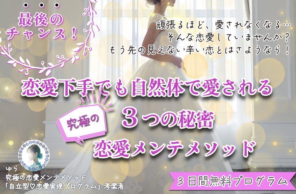 究極の恋愛メンテメソッド!3日間無料プログラムであなたの恋愛がなぜうまくいかないのか?確認してみませんか?